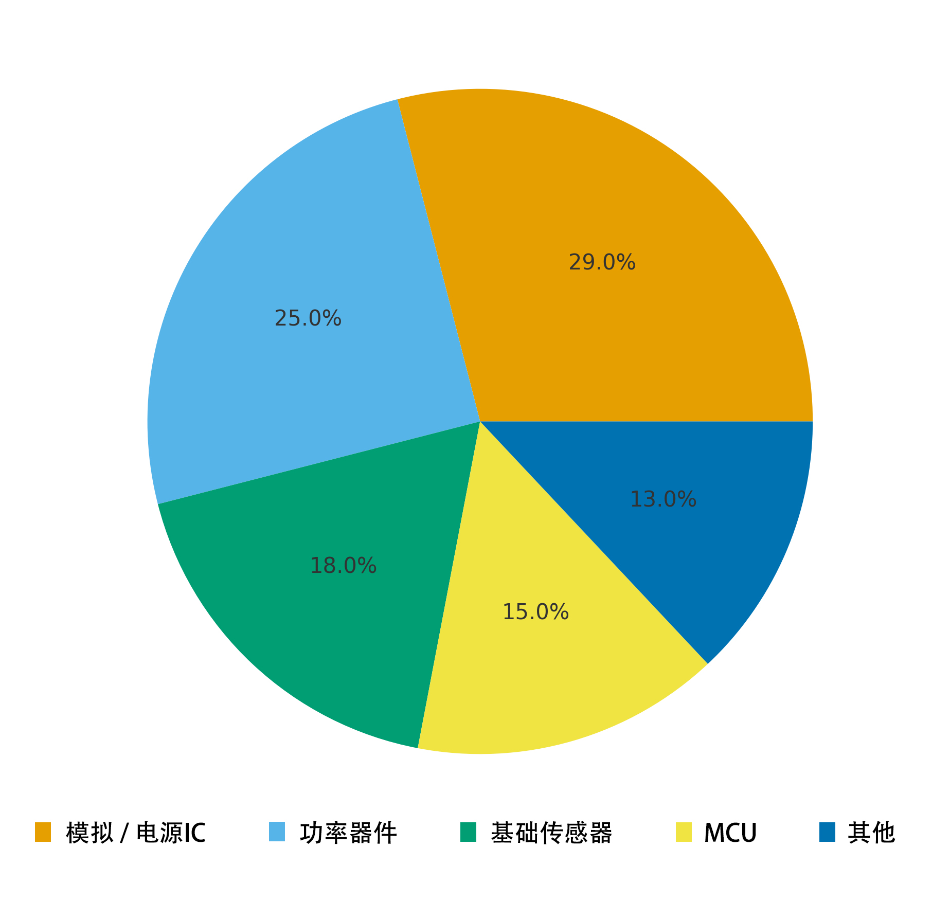 从芯片数量结构来看,汽车电子并不是由少数几类高价值芯片构成,相反,大量“基础型”器件构成了整车电子系统的骨架。在典型的一辆车中,模拟/电源IC占比约29%,是数量最多的一类,承担信号调理、电压管理、驱动控制等最基础却最不可或缺的功能。功率器件约占25%,主要用于电源转换、电机驱动、车灯控制等高功率环节,是整车能量流的核心节点。基础传感器占比约18%,从压力、温度到加速度等传感器,共同构成车辆对外界环境与内部状态的感知体系。MCU 的占比约15%,负责具体功能域的本地控制,如车身、底盘、电池管理等。