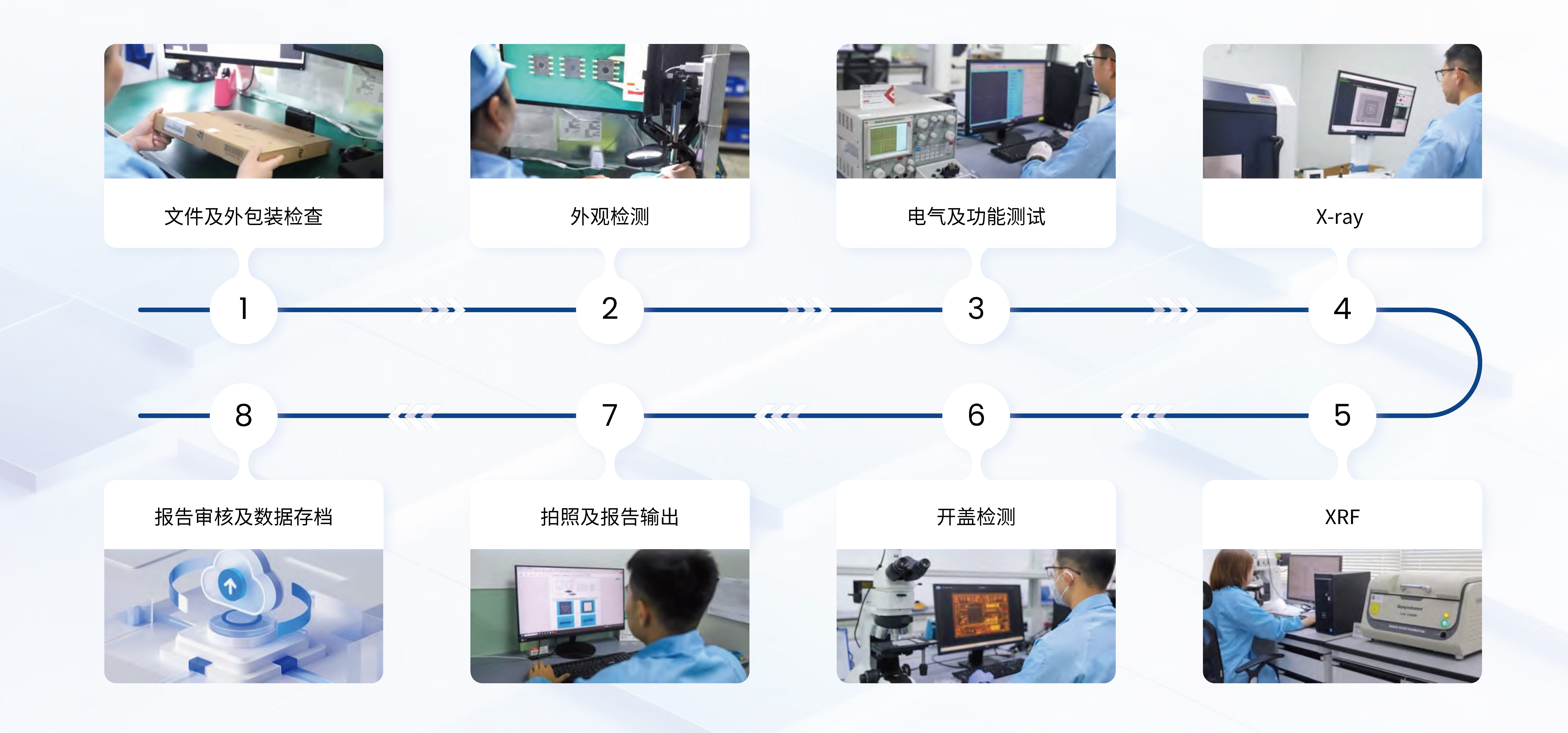 配备覆盖外观、真伪、电气与功能测试的检测设备体系,并由经验丰富的品质人员执行检验;全过程形成完备记录并输出标准报告,为每一次品质结论提供技术依据。