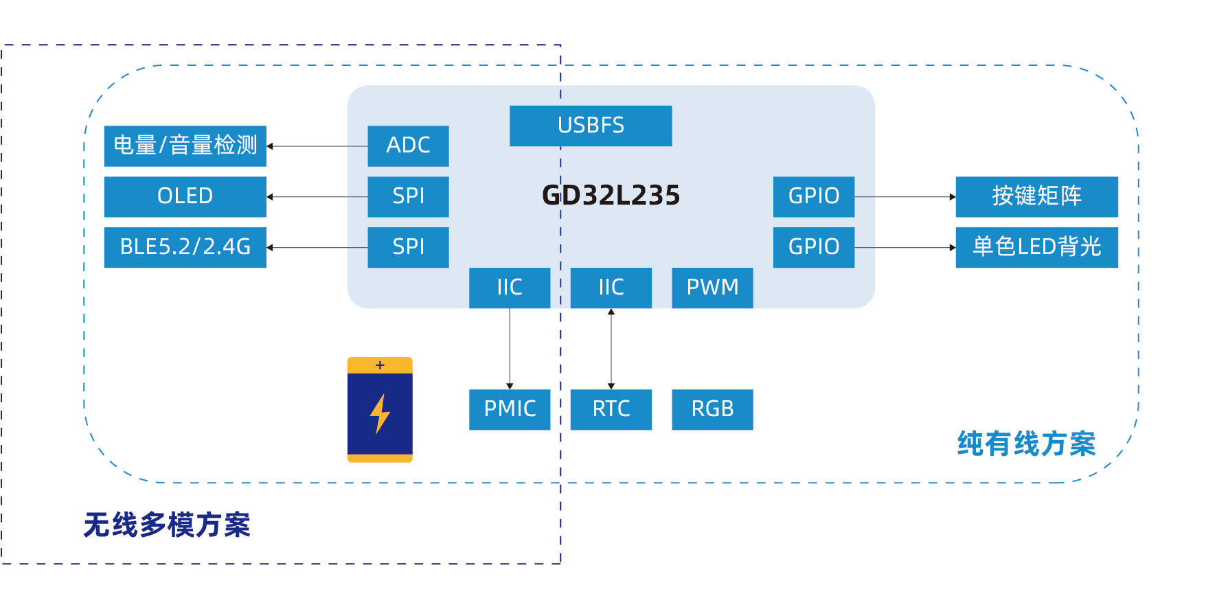 针对无线电竞键盘对功耗与连接稳定性的更高要求,GD32L235同样提供了成熟的解决方案支持。无线方案支持1至2节大容量锂电池的充放电管理设计,在无线模式下运行功耗显著低于行业平均水平。