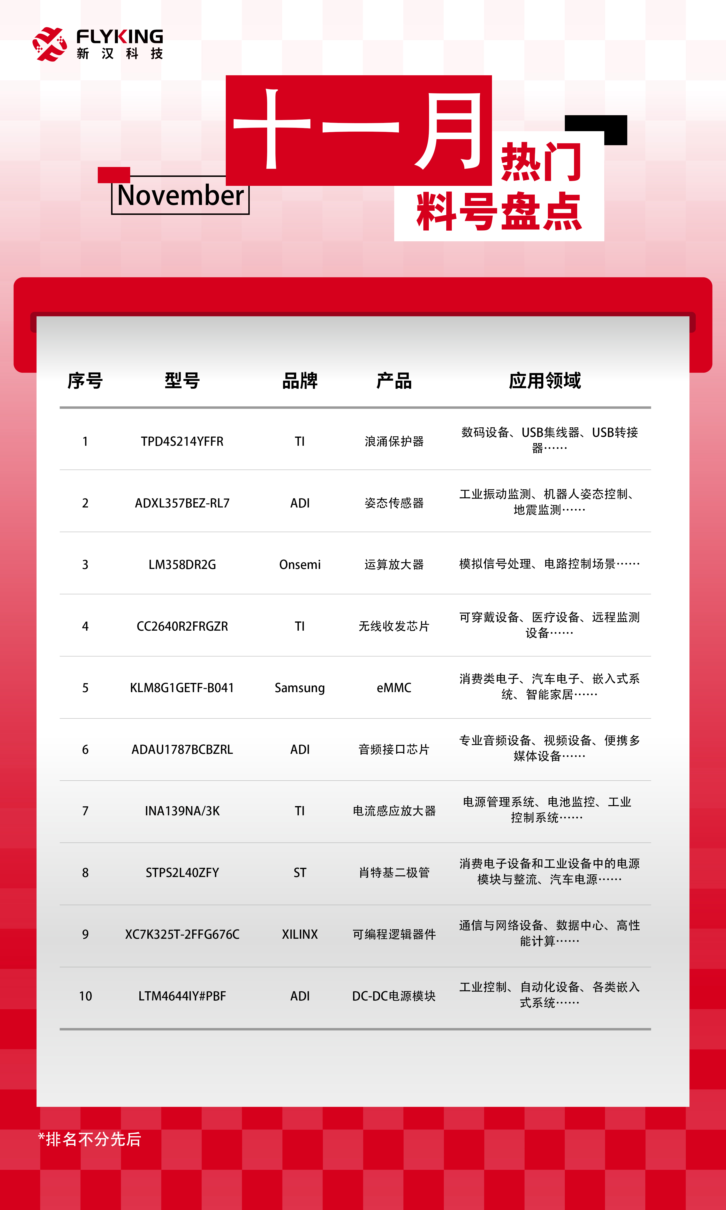 市场热度下,半导体需求呈现核心主线引领,加多领域共振的态势。无论是AI相关的高性能计算、存储升级场景,还是汽车电子、工业自动化、物联网等刚性需求领域,核心功能芯片均迎来采购热潮。基于客户咨询频次、市场热度以及行业应用广度,我们整理了11月份热门料号,为企业在产品选型和采购决策中提供有价值的参考方向。